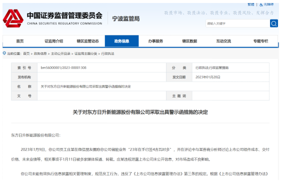 1月28日,寧波證監(jiān)局官網(wǎng)披露的一則《關(guān)于對(duì)東方日升新能源股份有限公司采取出具警示函措施的決定》顯示,東方日升員工莊某在微信朋友圈違規(guī)泄露上市公司未公開信息,對(duì)市場(chǎng)造成不良影響。因公司未能有效執(zhí)行信息披露相關(guān)管理制度,規(guī)范員工行為,違反了《上市公司信息披露管理辦法》第三條的規(guī)定,寧波證監(jiān)局決定對(duì)東方日升采取出具警示函的行政監(jiān)管措施。