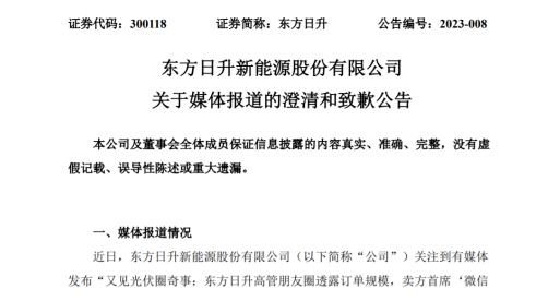 雖然朋友圈留存的時(shí)間不長(zhǎng),但其內(nèi)容還是被有關(guān)媒體捕捉到并迅速曝光。就此,東方日升于1月12日就相關(guān)媒體報(bào)道發(fā)布澄清和致歉公告,將涉及的有關(guān)言論的具體情況、公司儲(chǔ)能業(yè)務(wù)訂單情況及電池組件非硅成本情況進(jìn)行了說(shuō)明。公告稱“莊英宏發(fā)布的相關(guān)言論均系其個(gè)人行為,不代表公司立場(chǎng)。”“莊英宏所述‘23年在手已簽4吉瓦時(shí)多了’為其與公司儲(chǔ)能業(yè)務(wù)相關(guān)同事交流了解后作出的個(gè)人理解,口徑為公司雙簽訂單量與意向在談?dòng)唵瘟康暮喜⒘俊?rdquo;