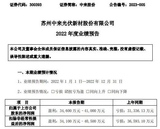 中來股份(300393)近日發(fā)布2022年年度業(yè)績預(yù)告,報告期內(nèi)歸屬于上市公司股東的凈利潤34,600萬元–41,000萬元,較上年同期扭虧為盈。
