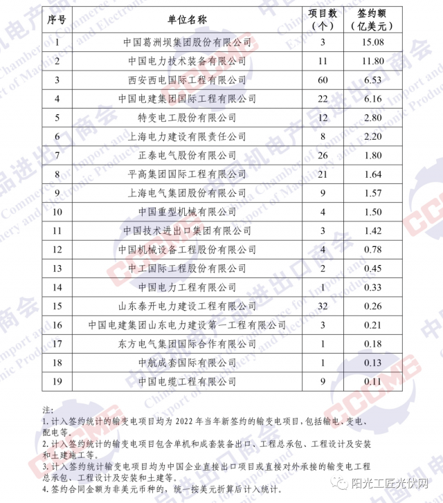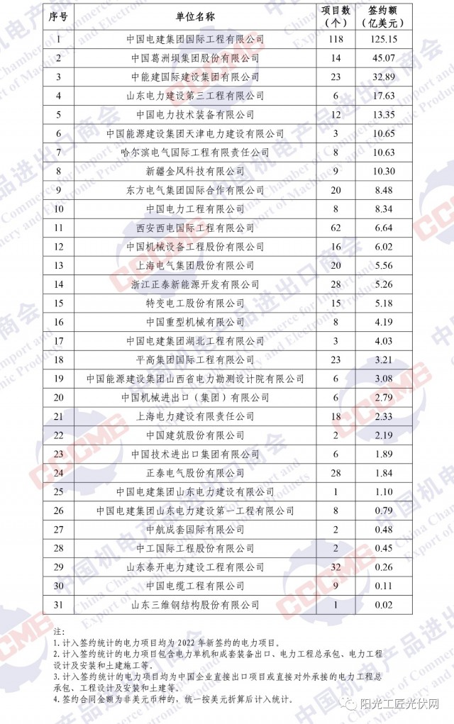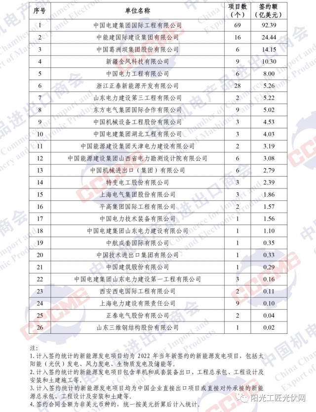 根據(jù)各重點企業(yè)報送的2022年境外電力項目的新簽約情況,中國機電商會對企業(yè)簽約額進行了排名?,F(xiàn)將企業(yè)排名及火電、水電、輸變電、新能源(太陽能、風、生物質(zhì)、儲能等)及太陽能(光伏)、風電行業(yè)簽約排名予以發(fā)布。