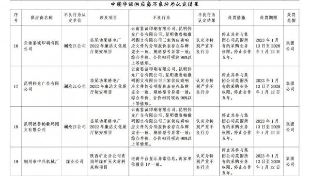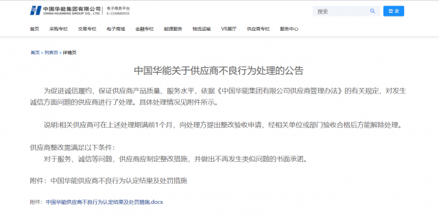 公告稱:為促進(jìn)誠信履約,保證供應(yīng)商產(chǎn)品質(zhì)量、服務(wù)水平,依據(jù)《中國華能集團(tuán)有限公司供應(yīng)商管理辦法》的有關(guān)規(guī)定,對(duì)發(fā)生誠信方面問題的供應(yīng)商進(jìn)行了處理。