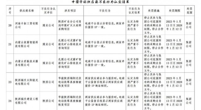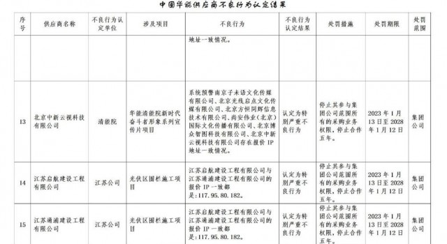 1月30日,華能集團(tuán)發(fā)布《關(guān)于供應(yīng)商不良行為處理的公告》,共處罰27家企業(yè)。其中包括3家光伏相關(guān)公司。