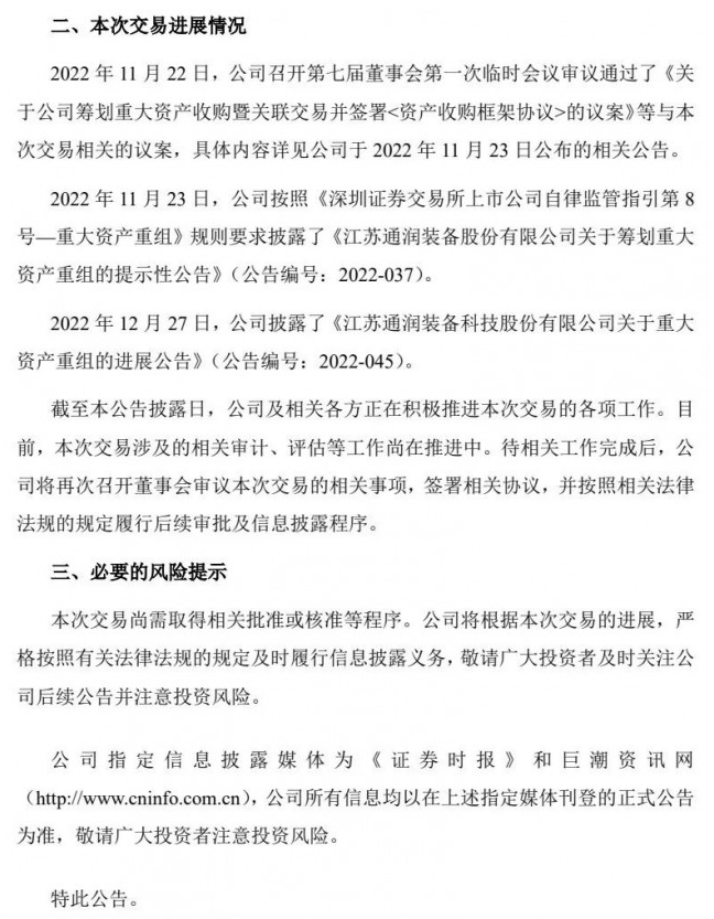 2022年12月27日,公司披露了《江蘇通潤裝備科技股份有限公司關(guān)于重大資產(chǎn)重組的進(jìn)展公告》。截至本公告披露日,公司及相關(guān)各方正在積極推進(jìn)本次交易的各項工作。目前,本次交易涉及的相關(guān)審計、評估等工作尚在推進(jìn)中。待相關(guān)工作完成后,公司將再次召開董事會審議本次交易的相關(guān)事項,簽署相關(guān)協(xié)議,并按照相關(guān)法律法規(guī)的規(guī)定履行后續(xù)審批及信息披露程序。