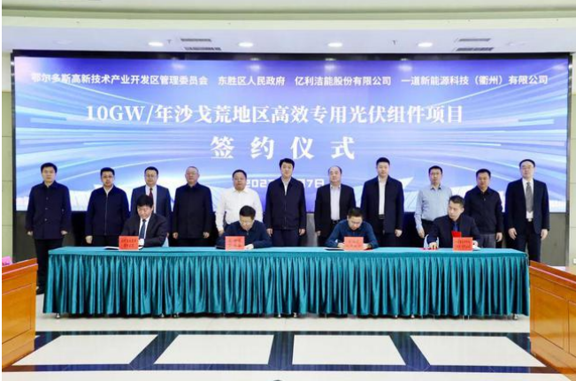3月7日,在內(nèi)蒙古風光氫儲產(chǎn)業(yè)集群重鎮(zhèn)鄂爾多斯東勝區(qū),億利潔能股份有限公司與鄂爾多斯高新技術(shù)產(chǎn)業(yè)開發(fā)區(qū)管委會、東勝區(qū)人民政府、一道新能源科技(衢州)有限公司成功簽約10GW沙戈荒地區(qū)高效專用光伏組件項目。