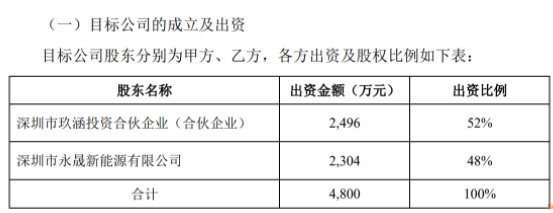 聯(lián)合出資競拍,加速布局新能源領(lǐng)域本次公告顯示,深圳永晟與玖涵投資共同成立的合資公司注冊資本為4800萬元,其中玖涵投資以人民幣現(xiàn)金出資2496萬元,占注冊資本的52%;深圳永晟以人民幣現(xiàn)金出資2304萬元,占注冊資本的48%。