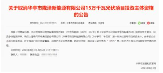 2023年4月3日華亭市發(fā)展和改革局發(fā)文,根據(jù)《甘肅省風(fēng)電、光伏發(fā)電項(xiàng)目競爭配置指導(dǎo)方案》(甘發(fā)改能源〔2021〕327號)和《華亭市光伏項(xiàng)目競爭性配置辦法》規(guī)定及有關(guān)要求,經(jīng)競爭性配置評審,確定上海電氣風(fēng)電集團(tuán)股份有限公司(華亭市隴澤新能源有限公司)為華亭市“十四五”第一批光伏發(fā)電項(xiàng)目投資主體。由于該企業(yè)未履行備案承諾,經(jīng)上級部門多次調(diào)度督導(dǎo),項(xiàng)目仍無實(shí)質(zhì)性進(jìn)展,經(jīng)研究決定,取消該公司華亭市“十四五”第一批15萬千瓦光伏項(xiàng)目投資主體的資格。公告時(shí)間:2023年4月3日-4月6日(3個(gè)工作日)