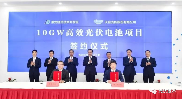 活動開始前,參加活動的領導共同見證了淮安經濟技術開發(fā)區(qū)與天合光能股份有限公司總投資50億元的10GW高效光伏電池生產項目簽約,參觀了天合光能淮安基地一期項目光伏組件和光伏電池車間。