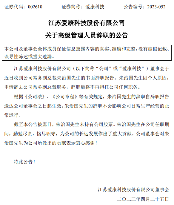 4月24日,愛康科技(002610.SZ)發(fā)布公告稱:董事會于近日收到公司常務(wù)副總裁朱治國先生的書面辭職報告。朱治國先生因個人原因,申請辭去公司常務(wù)副總裁職務(wù),辭職后將不再擔(dān)任公司任何職務(wù)。