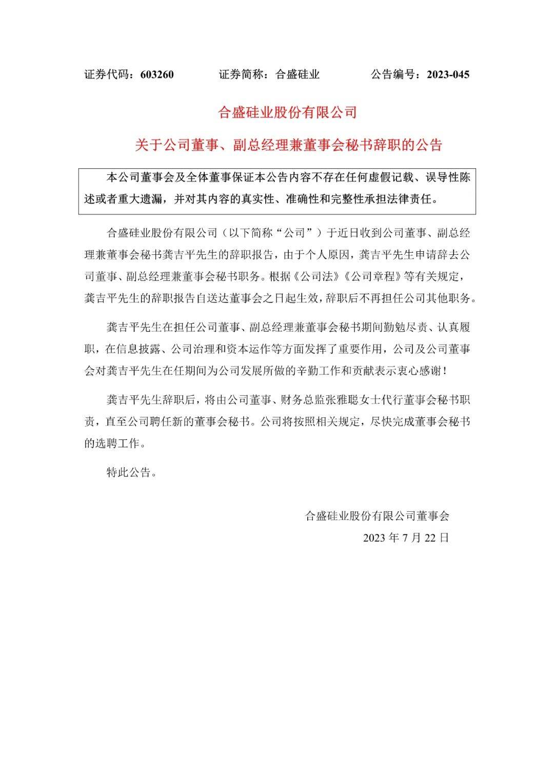 合盛硅業(yè)7月22日發(fā)布公告稱,由于個人原因,龔吉平申請辭去公司董事、副總經(jīng)理兼董事會秘書職務(wù)。