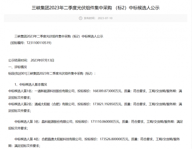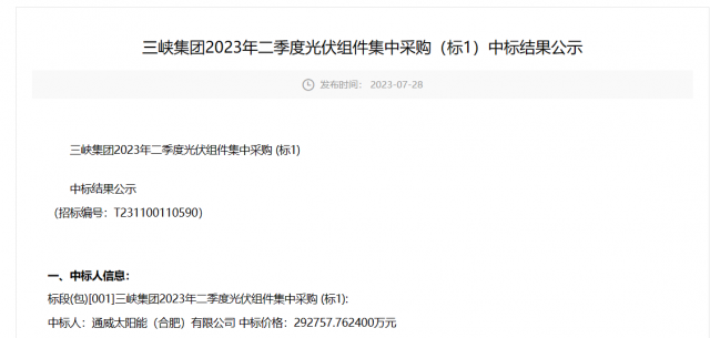 7月28日,三峽2023年二季度光伏組件集中采購(gòu)(標(biāo)1)中標(biāo)結(jié)果公示,通威以1.3元/瓦的報(bào)價(jià)獨(dú)享2249.4MW的光伏組件訂單,組件型號(hào)為P型545W+雙面。