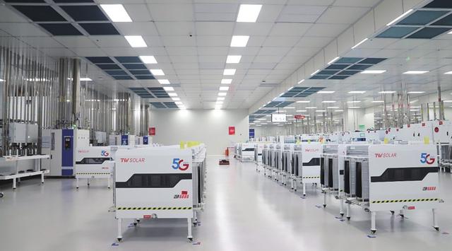 此外,通威還打造全球光伏行業(yè)首個5G智慧園區(qū)——通威太陽能成都金堂基地?;貎?nèi)擁有11個足球場大小的無塵車間,32條全自動智能制造生產(chǎn)線高效運轉(zhuǎn),數(shù)百臺智能小車來回穿梭運送物料,經(jīng)過制絨、擴散、SE激光摻雜等10道工序,每天生產(chǎn)500多萬片太陽能電池片。這里的智能制造生產(chǎn)線,與同等產(chǎn)能的傳統(tǒng)太陽能電池片生產(chǎn)線相比,用工減少約62%,能源消耗降低約30%,生產(chǎn)效率提升約161%。