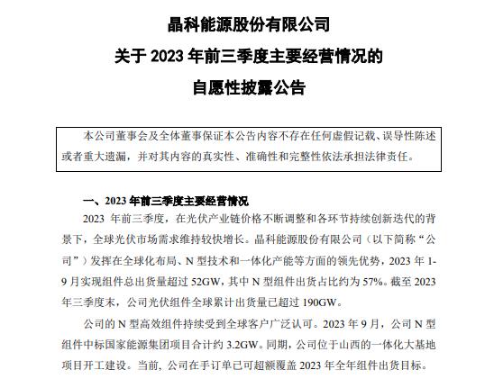 晶科能源公告稱,1-9月實現(xiàn)組件總出貨量超過52GW,其中N型組件出貨占比約為57%;截至2023年三季度末,公司光伏組件全球累計出貨量已超過190GW。