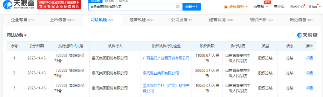 據(jù)天眼查App顯示,近日,皇氏集團(tuán)新增3則股權(quán)凍結(jié)信息,被凍結(jié)股權(quán)數(shù)額合計(jì)約4.1億人民幣,股權(quán)被執(zhí)行企業(yè)為廣西皇氏產(chǎn)業(yè)園開發(fā)有限公司、皇氏乳業(yè)集團(tuán)有限公司、皇氏農(nóng)光互補(bǔ)(廣西)科技有限公司,凍結(jié)期限自2023年11月16日至2026年11月15日。