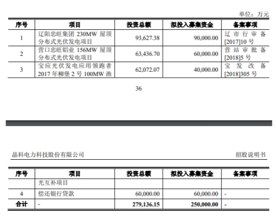 晶科科技發(fā)行募集資金總額為25.98億元,募集資金凈額為24.17億元。晶科科技最終募集資金凈額比原計(jì)劃少8324.30萬(wàn)元。2020年4月25日,晶科科技披露的招股說(shuō)明書顯示,公司擬募集資金25.00億元,分別用于遼陽(yáng)忠旺集團(tuán)230MW屋頂分布式光伏發(fā)電項(xiàng)目、營(yíng)口忠旺鋁業(yè)156MW屋頂分布式光伏發(fā)電項(xiàng)目、寶應(yīng)光伏發(fā)電應(yīng)用領(lǐng)跑者2017年柳堡2號(hào)100MW漁光互補(bǔ)項(xiàng)目、償還銀行貸款。