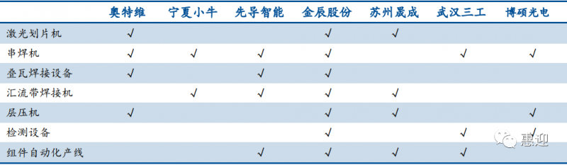 組件設(shè)備的市場(chǎng)較為分散,公司數(shù)量較多,競(jìng)爭(zhēng)較為充分。組件設(shè)備國產(chǎn)化進(jìn)程較早,廠商可提供多種產(chǎn)品,充分利用技術(shù)同源和客戶同源優(yōu)勢(shì)。如奧特維可提供激光劃片機(jī)、串焊機(jī)、疊瓦串焊機(jī)、層壓機(jī)等設(shè)備,先導(dǎo)智能可提供串焊機(jī)、疊瓦一體焊接機(jī)、匯流條焊接機(jī)等設(shè)備,金辰股份可提供激光劃片機(jī)、串焊機(jī)、疊片焊接機(jī)、層壓機(jī)、匯流條焊接機(jī)、層壓機(jī)、EL 測(cè)試儀等設(shè)備。同時(shí),先導(dǎo)智能、金辰股份、蘇州晟成、武漢三工還可提供組件自動(dòng)化生產(chǎn)線。