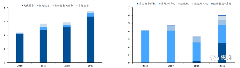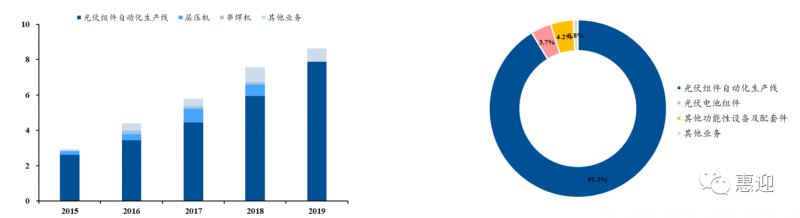 多主柵串焊機(jī)逐步成為公司光伏設(shè)備中的主要構(gòu)成產(chǎn)品。2018 年,公司多主柵串焊機(jī)開始放量,在公司光伏設(shè)備收入中占比約為 5.88%,2019 年,公司多主柵串焊機(jī)收入從 0.2 億元提升至 2.52 億元,占光伏設(shè)備收入中的 40.91%,超越常規(guī)串焊機(jī),成為公司光伏設(shè)備業(yè)務(wù)中占比最高的業(yè)務(wù),成為公司的營業(yè)收入中占比最高的業(yè)務(wù)。未來,公司的串焊機(jī)有望深度受益于光伏組件技術(shù)迭代,在新一輪市場(chǎng)擴(kuò)展中占據(jù)優(yōu)勢(shì)地位。