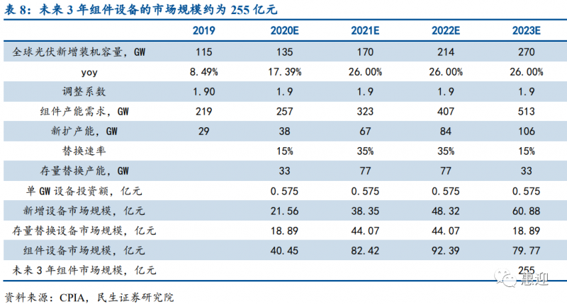 經(jīng)民生證券測(cè)算,預(yù)計(jì) 2021 年、2022 年、2023 年組件設(shè)備的市場(chǎng)規(guī)??煞謩e達(dá)到 82.42 億元、92.39 億元和 79.77 億元,未來 3 年組件設(shè)備的市場(chǎng)規(guī)模合計(jì)可達(dá) 255 億元,組件設(shè)備廠商擁有廣闊的發(fā)展前景。