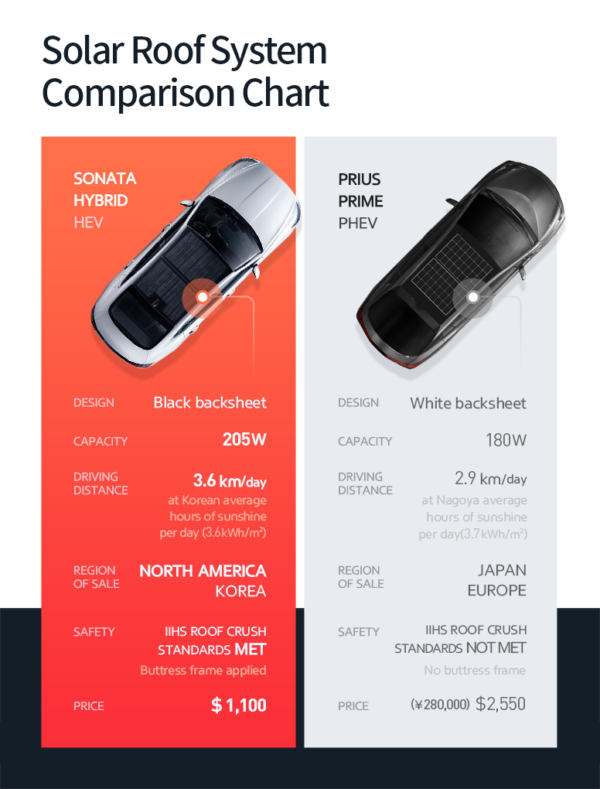 現(xiàn)代公司表示,其太陽能電池陣列系統(tǒng)與競爭對手的汽車相比具有高效的設計優(yōu)勢,如配備太陽能車頂?shù)呢S田普銳斯。普銳斯有一個單獨的太陽能電池,需要兩個階段的轉換來為高壓驅動電池和輔助“啟動”電池充電。索納塔只進行一次轉換,直接通過電池板向最大功率點跟蹤器充電控制器輸送電力,并直接進入輔助電池和驅動電池。