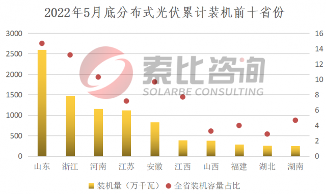 而分布式光伏方面,截至2022年5月底,累計裝機(jī)排名前三的省份分別是山東、浙江,江蘇,累計裝機(jī)分別為25.9GW、14.7GW、11.6GW。