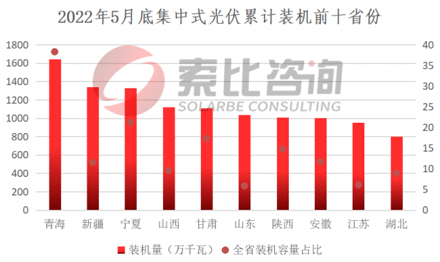 其中,集中式光伏方面,截至2022年5月底,累計裝機(jī)排名前三的省份分別是青海、新疆、寧夏,累計裝機(jī)分別為16.4GW、13.4GW、13.3GW。