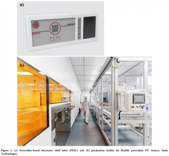市場(chǎng)規(guī)模和增長(zhǎng)當(dāng)然不是唯一需要考慮的重要方面。從制造商的角度來看,開發(fā)定制量最少的產(chǎn)品很重要,因?yàn)檫@會(huì)帶來額外的風(fēng)險(xiǎn)和成本。此外,如何將額外的功率預(yù)算貨幣化是非常重要的??紤]到所有這些,電子貨架標(biāo)簽似乎是最有吸引力的選擇之一。Saule 開發(fā)的基于鈣鈦礦的電子貨架標(biāo)簽 (PESL) 的示例和用于制造柔性鈣鈦礦 PV 的試點(diǎn)生產(chǎn)設(shè)施如圖 2 所示。