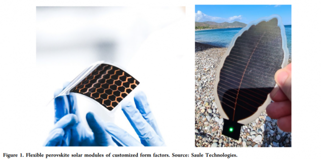 塑料箔的使用還為光伏產(chǎn)品提供了一系列新的優(yōu)勢(shì),其中非成本相關(guān)因素可以提供重要的杠桿作用,例如重量輕、比功率高以及易于與各種表面集成。(7) 將鈣鈦礦與成熟的光伏技術(shù)區(qū)分開來的一個(gè)重要因素是高水平產(chǎn)品定制的可能性,符合客戶在特定應(yīng)用中的需求。 這可以在同時(shí)進(jìn)入市場(chǎng)的同時(shí)實(shí)現(xiàn)更長(zhǎng)時(shí)間的技術(shù)孵化,從而緩解大規(guī)模市場(chǎng)進(jìn)入的挑戰(zhàn)。(8) 定制的柔性鈣鈦礦太陽(yáng)能組件示例如圖 1 所示。
