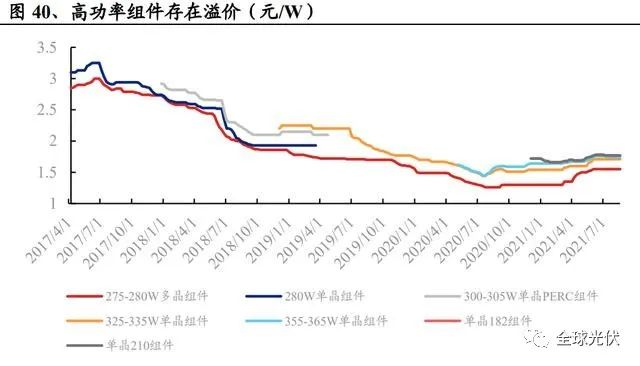 從最終組件端綜合成本來(lái)看,當(dāng)前 P-IBC 電池已經(jīng)具備成本優(yōu)勢(shì),TOPcon 成本較 PERC 稍高,HJT 電池成本還需進(jìn)一步下降。溢價(jià):TOPcon 高效組件產(chǎn)品溢價(jià)約為 0.1 元/W。新型產(chǎn)品性價(jià)比除了考慮 絕對(duì)成本優(yōu)勢(shì)外,還需考慮高功率溢價(jià)優(yōu)勢(shì)。參考PVinfolink數(shù)據(jù),2017-2020年 間,單晶組件相對(duì)于多晶組件長(zhǎng)期保持 8%-10%的價(jià)格溢價(jià),大尺寸(182及 210) 高功率組件產(chǎn)品相對(duì)于常規(guī)功率組件也能保持一定溢價(jià)。