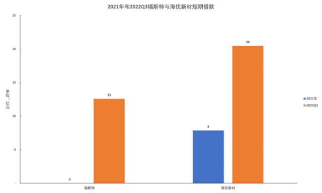 營(yíng)運(yùn)壓力的陡增,也迫使企業(yè)提高借貸規(guī)模。截至2022Q3,福斯特的短期借款規(guī)模達(dá)到創(chuàng)紀(jì)錄的12.59億元,要知道,自上市以來,公司的短期借款最高不超過2000萬。而海優(yōu)新材的短期借款規(guī)模更是達(dá)到了20.48億元,相比于2021年全年提高160%。受此影響,兩者的資產(chǎn)負(fù)債率分別達(dá)到23.43%和59.14%,相比于2021年的10.94%和37.21%分別提升114%和59%。
