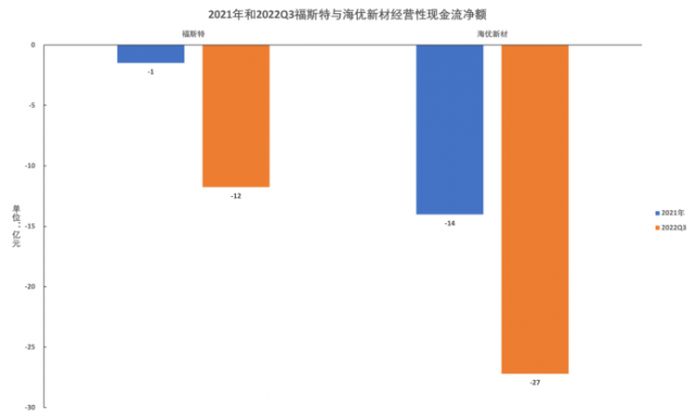 而且,隨著經(jīng)營(yíng)規(guī)模的擴(kuò)大,企業(yè)的營(yíng)運(yùn)壓力也不斷提升。截至2022Q3,福斯特和海優(yōu)新材的應(yīng)收賬款較2021年全年提高32%和52%,預(yù)付款項(xiàng)提高195%和347%。而流動(dòng)比率則下降53%和25%,經(jīng)營(yíng)性現(xiàn)金流更是呈凈流出態(tài)勢(shì),且規(guī)模顯著提升,分別達(dá)到11.76億元和27.20億元,降幅高達(dá)695%和94%。
