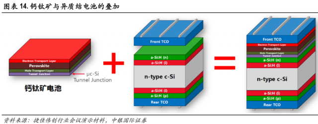 異質(zhì)結(jié)疊加鈣鈦礦進一步提升效率上限:異質(zhì)結(jié)電池同時比較適合疊加鈣鈦礦成為疊層/多結(jié)電池。疊層技術(shù)需要用低溫沉積工藝(PVD/CVD 方式)實現(xiàn)短波長吸收(鈣鈦礦)和長波長吸收(HJT)的結(jié)合,其所應(yīng)用的TCO膜層已然在異質(zhì)結(jié)電池中采用,而在HJT單結(jié)中損失的藍光可被上層鈣鈦礦收集利用。