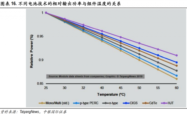 低溫度系數(shù)提高發(fā)電穩(wěn)定性:光伏電池在發(fā)電的過程中由于太陽光的照射和自身電流產(chǎn)生的熱效應(yīng), 電池表面溫度會有一定程度的上升。一般情況下當溫度上升時,光伏電池的開路電壓下降、短路電流上升,且電壓降幅一般大于電流升幅,因此溫度上升一般會導致電池轉(zhuǎn)換效率下降。目前主流的單晶PERC電池的溫度系數(shù)一般在-0.4%/℃(即溫度每升高 1℃,發(fā)電功率相對于基準功率降低 0.4%) 左右,而異質(zhì)結(jié)電池的溫度系數(shù)僅約-0.25%/℃,因此在長時間光照溫度升高的情況下,使用異質(zhì)結(jié)電池的光伏電站發(fā)電量和發(fā)電穩(wěn)定性都更高。