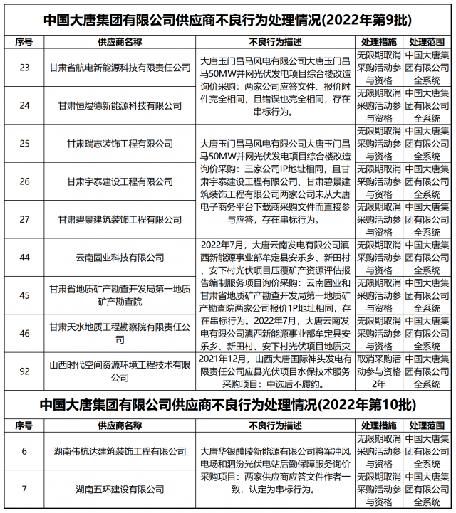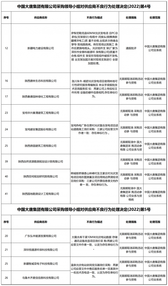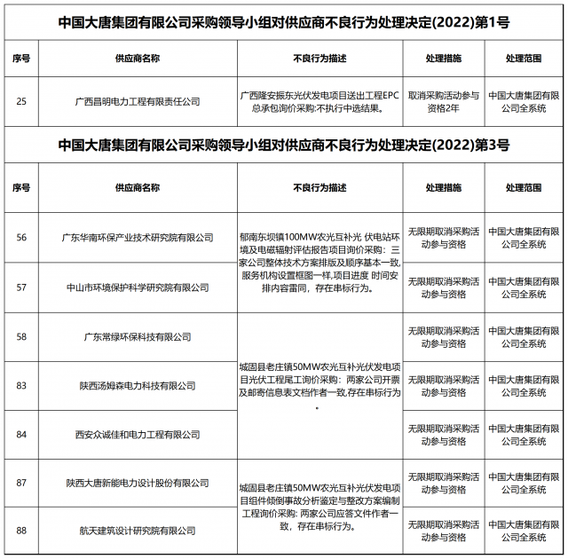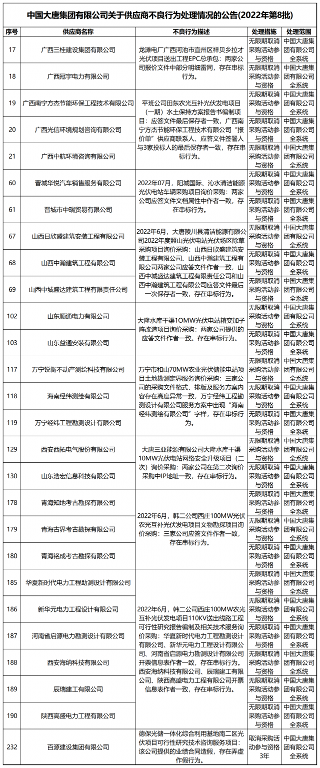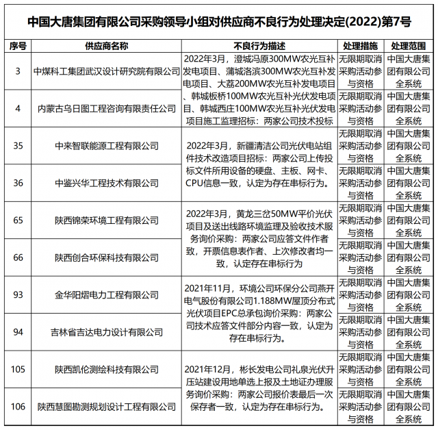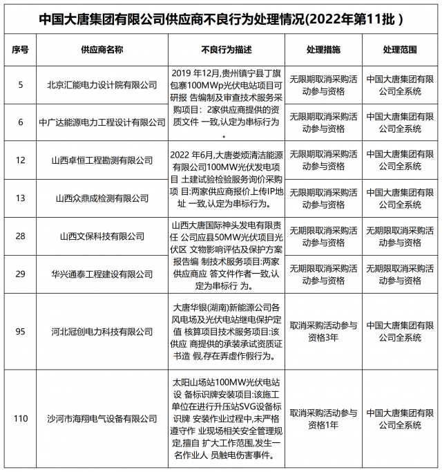 12月13日,中國大唐集團有限公司關(guān)于供應商不良行為處理情況的公告 (2022年第12批)公示,對出現(xiàn)不誠信行為、履約不力以及產(chǎn)品質(zhì)量等問題的供應商進行了處理。本批次大唐集團共公布受處罰企業(yè)137家,其中,光伏相關(guān)企業(yè)共6家。
