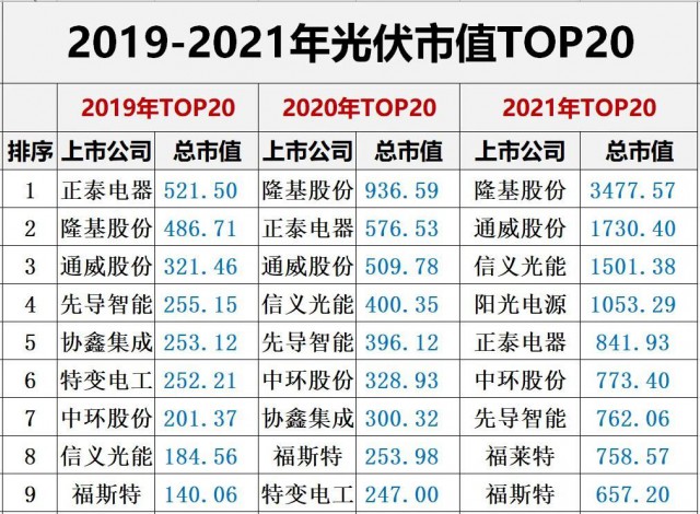 2005年以后,隨著無錫尚德、江西賽維、天合光能、阿特斯、晶科、晶澳等一眾中國光伏企業(yè)成功搶灘美國資本市場,由此開啟了中國光伏的大資本時代。時至今日,中國已有近150家光伏企業(yè)(光伏業(yè)務占比超30%)登陸全球資本市場。以下2001年至2021年期間,中國光伏上市企業(yè)“總市值TOP20,以下表格呈現(xiàn)總市值均為當年1月1日當天市值。