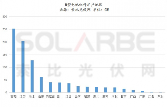 索比光伏網據(jù)公開數(shù)據(jù)統(tǒng)計,2022年至今,各光伏企業(yè)發(fā)布的N型電池組件擴產計劃超900GW,其中超600GW為電池,投資金額超4200億元,有超200GW預計在2023年投產。擴產企業(yè)有60家左右,其中20家為跨界光伏企業(yè),擴產規(guī)模占比近三成。從地區(qū)分布看,安徽、江浙地區(qū)的區(qū)位條件、營商環(huán)境吸引了最多企業(yè)的目光。