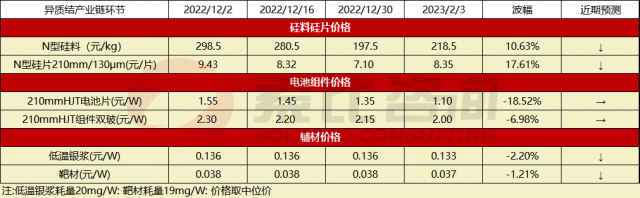 根據(jù)索比咨詢發(fā)布的異質結指數(shù),近兩個月時間異質結價格持續(xù)下降,本周輔材低溫銀漿和靶材的耗量持穩(wěn),異質結電池片較上期降幅18.5%,來到1.1元/W;異質結組件價格較上期降幅7%左右,來到2元/W左右。索比咨詢分析,本期HJT降本主要得益于低溫銀漿價格微幅下降,以及電池片量產效率提升攤薄靶材成本。