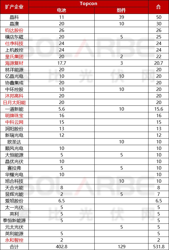 Topcon方面,2022年至今各家企業(yè)已發(fā)布超過530GW的電池、組件擴產計劃,其中擴產規(guī)模超10GW的企業(yè)就有26家。詳情見下: