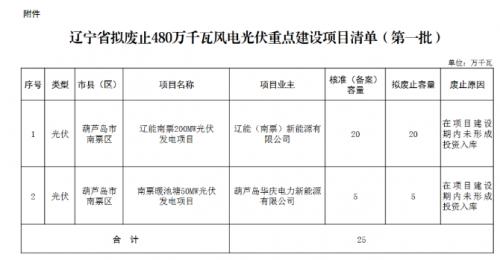公告稱,遼寧省480萬千瓦風電光伏重點建設(shè)項目中存在“核而不建”“建設(shè)滯后”等問題的風電光伏項目進行了梳理。相關(guān)地市上報了擬廢止項目清單,經(jīng)我委匯總,擬廢止未按期建成并網(wǎng)的遼能南票200MW光伏發(fā)電項目、南票暖池塘50MW光伏發(fā)電項目等2個光伏發(fā)電項目共計25萬千瓦未并網(wǎng)規(guī)模指標。