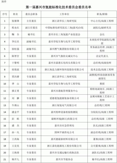 附件:第一屆嘉興市氫能標準化技術(shù)委員會委員名單