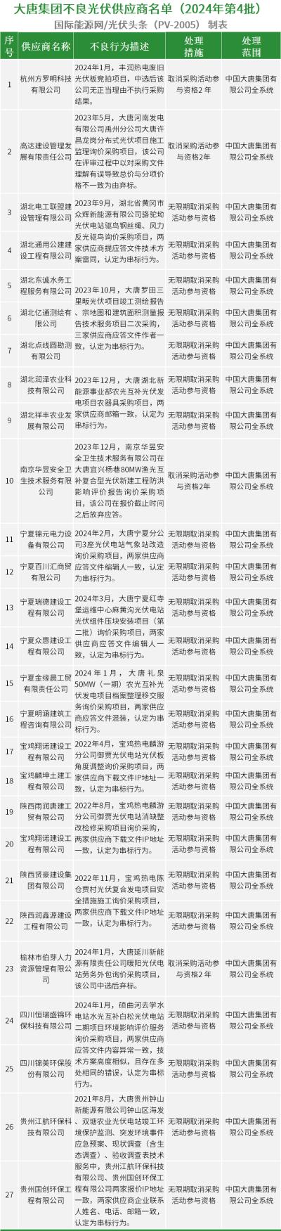此前,大唐集團供應商不良行為處理情況的公告(1-3批)發(fā)布。國際能源網(wǎng)/光伏頭條(PV-2005)經(jīng)過梳理,1-3批中共有58家企業(yè)與光伏行業(yè)相關,共涉及28個項目。其中,55家企業(yè)被處罰原因為存在串標行為,處理措施為無限期取消采購活動參與資格,處理范圍為中國大唐集團有限公司全系統(tǒng)。3家企業(yè)被處罰原因為中標后棄標,處理措施為取消采購活動參與資格2年,處理范圍為中國大唐集團有限公司全系統(tǒng)。(詳情查看:黑榜!55家光伏供應商被大唐永久拉黑!)