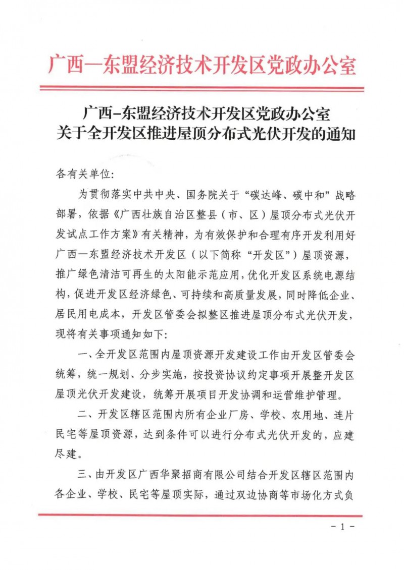 廣西-東盟經(jīng)濟技術(shù)開發(fā)區(qū)黨政辦公室發(fā)布關(guān)于全開發(fā)區(qū)推進屋頂分布式光伏開發(fā)的通知。