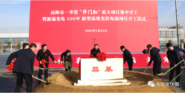 市委書記張利宣布開工,并和出席儀式的領(lǐng)導(dǎo)嘉賓共同為項目培土奠基。據(jù)悉,新瑞光電12GW新型高效光伏電池項目總投資100億元,是高郵經(jīng)開區(qū)有史以來首個百億元項目。該項目占地436畝,設(shè)備投資30億元,年產(chǎn)12GW高效TOPCon+HJT光伏電池。