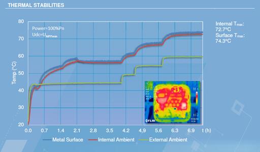 代表機(jī)型2:S廠商逆變器。逆變器內(nèi)部溫度比機(jī)箱外殼溫度高15度左右,在環(huán)境溫度45度條件下,內(nèi)部溫度約70度;