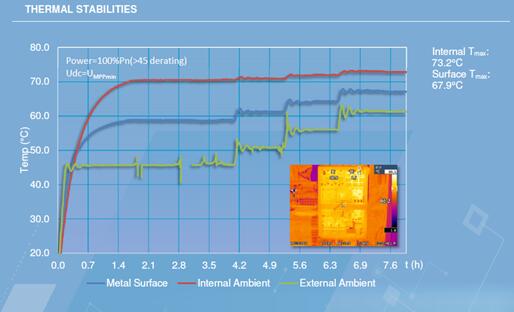 代表機(jī)型1:S廠商逆變器。逆變器內(nèi)部溫度比機(jī)箱外殼溫度高15度左右,在環(huán)境溫度45度條件下,內(nèi)部溫度約65度;