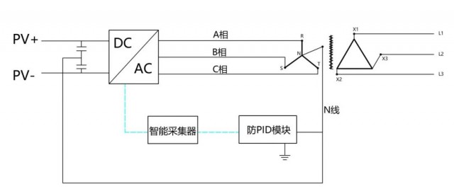 目前主流組件本身具備防PID效應功能,此外,逆變器也可以附加該功能,通過抬升交流輸出側(cè)N線電壓,間接抬升PV負極電壓,使各臺逆變器的PV負極對地電壓接近為0或者稍高于0電位,以達到抑制PID效應的目的。系統(tǒng)中數(shù)據(jù)采集器與逆變器和外置的防PID模塊連接通訊,自動采集逆變器的負極狀態(tài)信息,自動進行抬升調(diào)節(jié),從而實現(xiàn)智能防PID功能。
