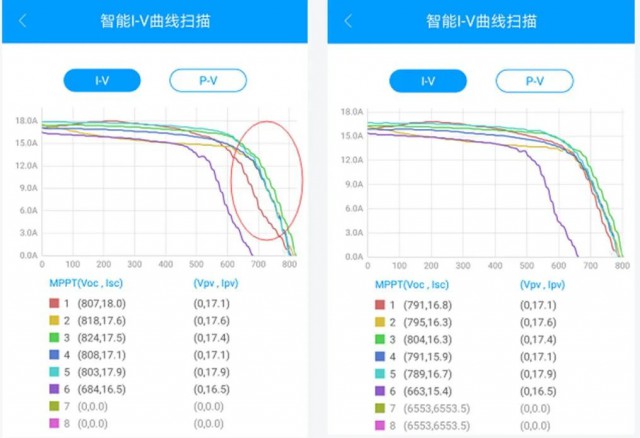 一旦組件發(fā)生陰影遮擋、損壞或者接觸不良等情況時,組件和組串的I/V曲線都會發(fā)生明顯的變化。