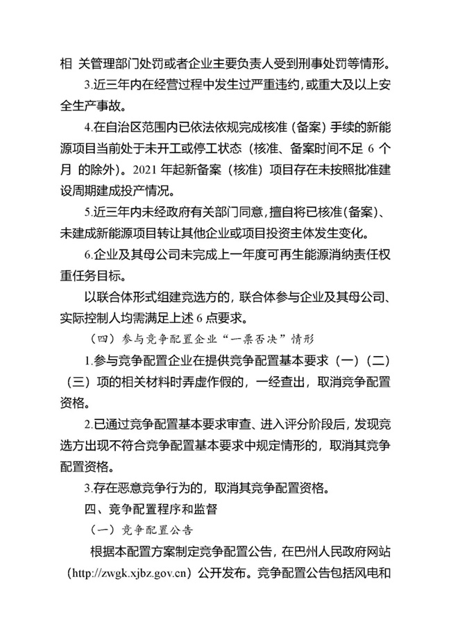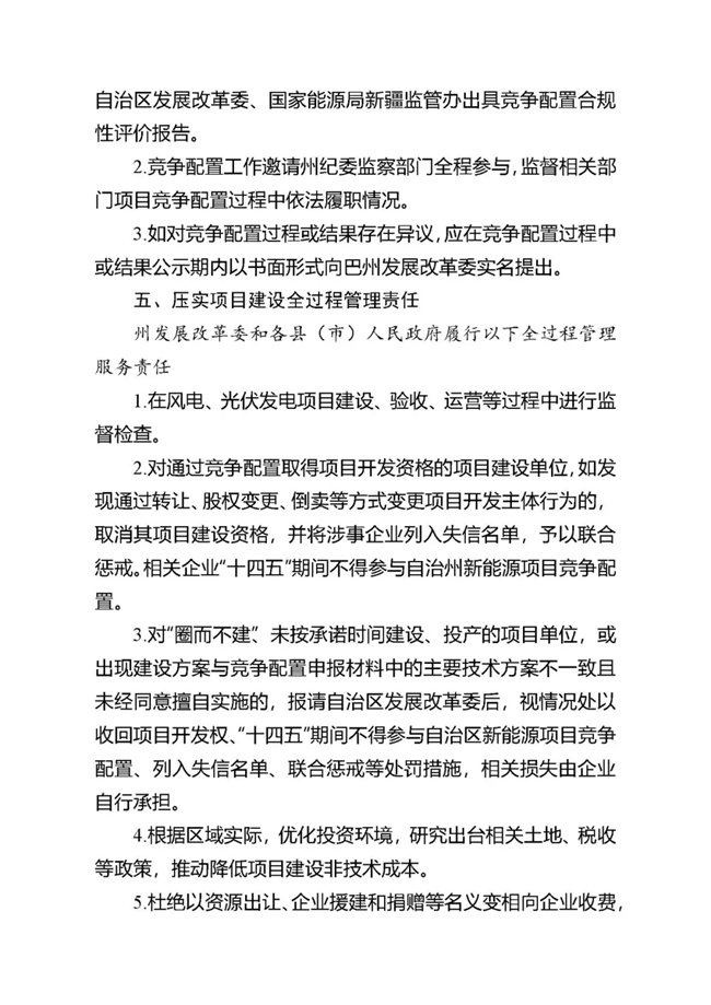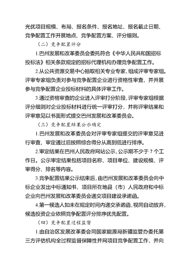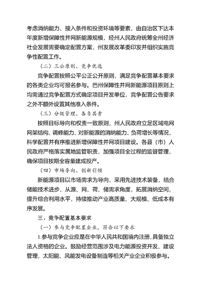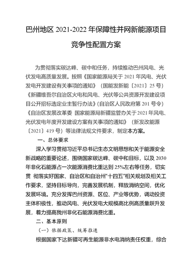 為貫徹落實碳達峰、碳中和任務,持續(xù)推動巴州風電、光伏發(fā)電高質量發(fā)展。按照《國家能源局關于2021年風電、光伏發(fā)電開發(fā)建設有關事項的通知》(國能發(fā)新能〔2021〕25號) 《新疆維吾爾自治區(qū)火電和風電、光伏等公共資源開發(fā)建設項目公開招標選定業(yè)主暫行辦法》(自治區(qū)人民政府第201號令)《自治區(qū)發(fā)展改革委國家能源局新疆監(jiān)管辦關于2021年風電、光伏發(fā)電年度開發(fā)建設方案有關事項的通知》(新發(fā)改能源〔2021〕419號)等法律法規(guī)文件要求,現(xiàn)將巴州2021-2022年保障性并網新能源項目競爭性配置公開優(yōu)選業(yè)主工作公告如下: