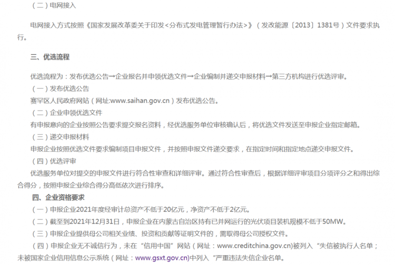 要求申報(bào)企業(yè)截至到2021年12月31日,在內(nèi)蒙古自治區(qū)持有已并網(wǎng)運(yùn)行的光伏項(xiàng)目裝機(jī)規(guī)模不低于50MW。