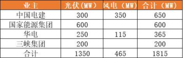 而在儲(chǔ)備項(xiàng)目庫(kù)中共9個(gè)項(xiàng)目,1.815GW。其中5個(gè)光伏項(xiàng)目,共計(jì)1.35GW;4個(gè)風(fēng)電項(xiàng)目共計(jì)465MW。中國(guó)電建650MW,國(guó)家能源集團(tuán)規(guī)模600MW,華電365MW,三峽200MW。具體如下: