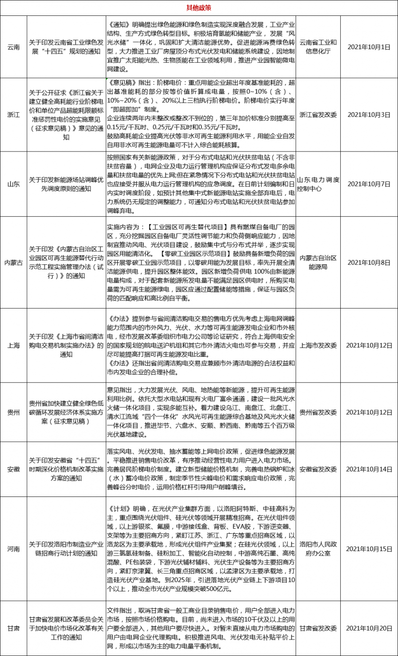 涉及光伏補(bǔ)貼/獎勵政策共3條。其中10月11日,北京市發(fā)改委等三部門發(fā)布了《關(guān)于印發(fā)進(jìn)一步完善市場導(dǎo)向的綠色技術(shù)創(chuàng)新體系若干措施的通知》。通知明確,支持創(chuàng)新型綠色技術(shù)示范應(yīng)用項(xiàng)目建設(shè)。原則上,補(bǔ)助標(biāo)準(zhǔn)不超過項(xiàng)目總投資的30%,單個項(xiàng)目補(bǔ)助金額最高不超過1000萬元。已享受其他市級政府資金支持的項(xiàng)目不再支持。