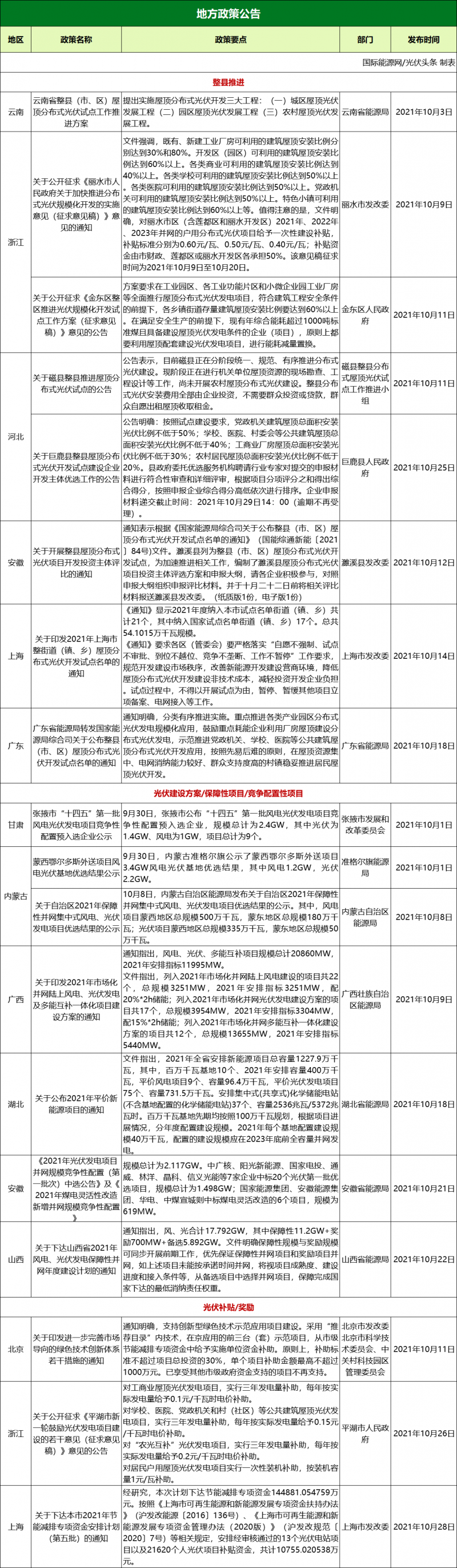 繼在9月國家能源局公布整縣(市、區(qū))屋頂分布式光伏開發(fā)試點(diǎn)名單的大背景下,10月份云南、浙江麗水市、浙江金華市金東區(qū)、河北磁縣、河北巨鹿縣、安徽濉溪縣、上海、廣東等8地出臺了整縣推進(jìn)屋頂分布式光伏相關(guān)政策。
